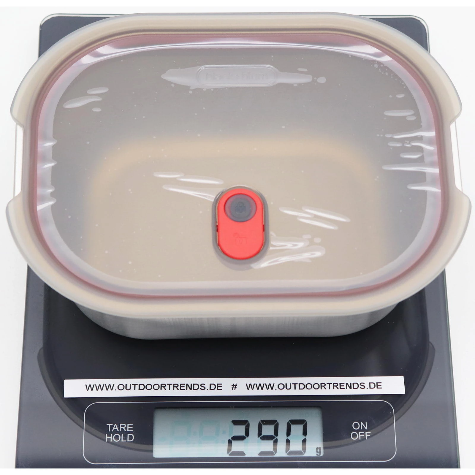 Die Steel Food Box 1,2 Liter von black+blum ist eine mikrowellengeeignete Edelstahl-Box zum Aufbewahren, Zubereiten, Aufwärmen oder Einfrieren. Dank eines Vakuum-Deckelverschlusses mit Ventil ist die Multifunktionsbox 100% auslaufsicher und zudem für die Mikrowelle geeignet. Laut Hersteller muss das Ventil beim Mikrowellenkochen geöffnet sein. In Intervallen von maximal 2 Minuten in der Mikrowelle erhitzen, umrühren und bei Bedarf wiederholen. Vorsicht beim Herausnehmen aus der Mikrowelle, da die Stahlbox heiß sein könnte. Zum Öffnen der Box muss das Ventil gedrückt werden, wodurch das Vakuum gelockert wird. Die Seite oder Ecke der Box mit einer Hand festhalten und den Deckel mit der anderen Hand an einer Seite oder Ecke vorsichtig anheben. Um sicherzustellen, dass die Proviantdose verschlossen 100% auslaufsicher ist, muss die Silikondichtung gleichmäßig um den Deckelrand sitzen und der Schalenrand sauber und trocken sein. Anschließend den Deckel bei geöffnetem Ventil an allen Seiten fest nach unten drücken, sodass keine Lücken sichtbar sind und dann das Ventil zum Verschließen drücken. Die Steel Food Box ist zusätzlich backofenfest (Deckel ist nicht backofenfest), gefrierschrank- und spülmaschinengeeignet (Deckel nur ins obere Fach) und kann platzsparend aufbewahrt werden, da sie ineinander stapelbar ist.