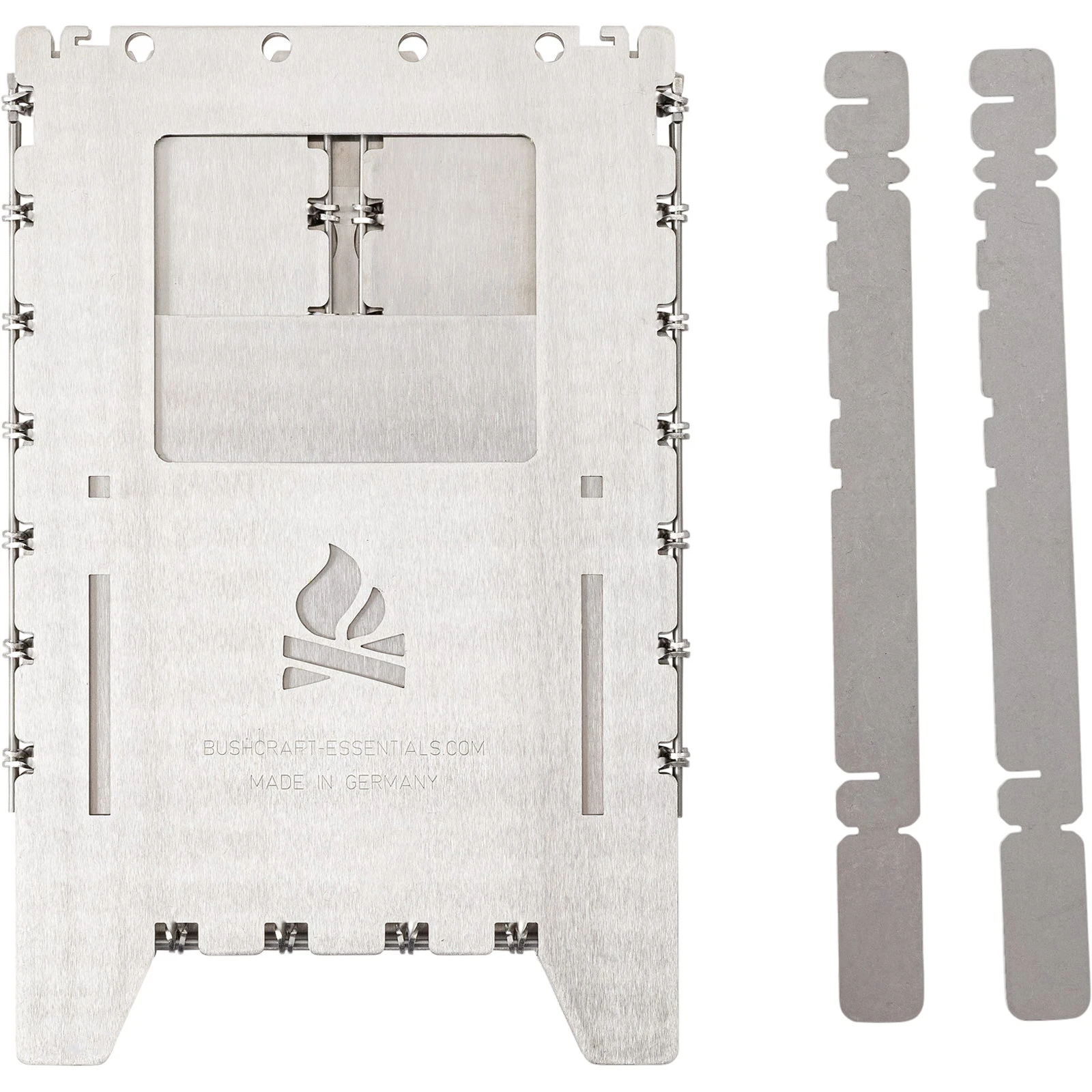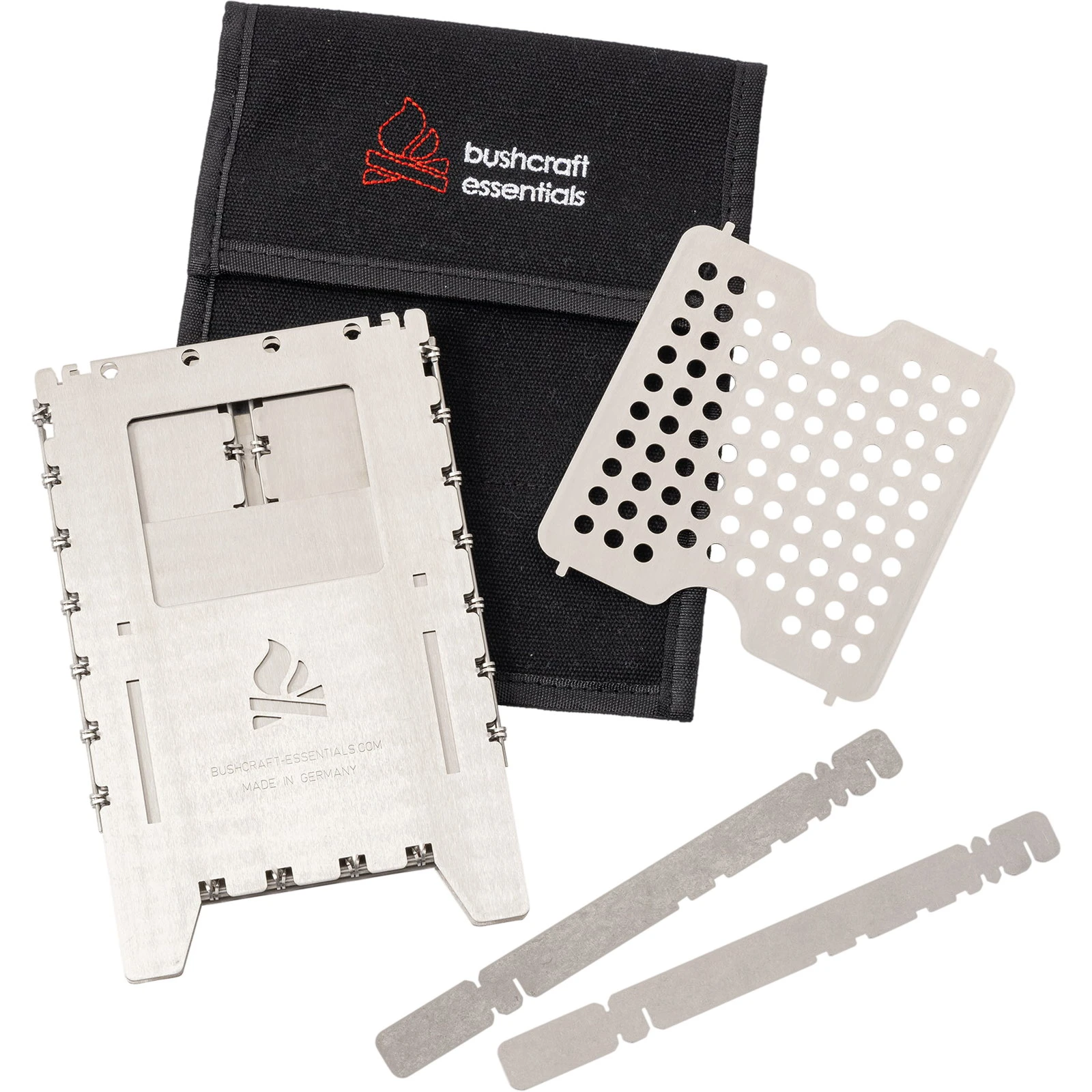 Der Bushbox XL von bushcraft essentials ist ein außerordentlich effizienter portabler Falt-Hobo-Kocher zum Grillen, Kochen, Wärmen. Zusammengefaltet nur ca. 1 cm dick. Perfekt für längere Outdoor-Trips, Camping, Trekking, Bushcraft, Biker, Expeditionen und und und… Unabhängig, vielfältig und einfach zu benutzen. Den Brennstoff gibt es kostenlos überall in der Natur – Zweige, Äste, Laub, Tierdung. Halteposition für Trangia Kocher. Zusammengeklappt ist dieser geniale Hobo-Ofen nur wenig dicker als 1 cm und lässt sich nahezu überall unterbringen. Der Bushbox XL wird an den Scharnieren einfach aufgeklappt und ist sofort einsatzbereit (er lässt sich auch mit Handschuhen oder klammen Händen problemlos aufbauen, was bereits auf Expeditionen unter Beweis gestellt wurde). Der Bushbox XL arbeitet nach dem Kamin-Prinzip: Luft strömt von unten in den Kocher, bringt sogar noch feuchtes Material zum Brennen und erzeugt starke Hitze, was weiter dadurch unterstützt wird, dass die Hitze im Gegensatz zu einer offenen Flamme kaum nach den Seiten abstrahlen kann und dadurch vorwiegend nach oben gelenkt wird. Der Bushbox XL ist ein Effizienzwunder. Schon mit wenigen kleinen Zweigen lässt sich Wasser in unter 4 Minuten zum Kochen bringen, Fleisch grillen, Essen zubereiten – und vieles mehr. Als Brennstoff kann neben praktisch jedem natürlichen bzw. festen Brennstoff wie Holz, Rinde, Holzkohle (sogar trockner Tierdung) auch ein Spiritusbrenner, Esbit-Tabletten oder ein Gel-Kocher verwendet werden. Durch zwei mitgelieferte Stäbe kann eine externe Wärmequelle (z.B. Trangia) auf jeder beliebigen Höhe in der Bushbox XL plaziert werden. Diese Stäbe lassen sich auch auf der Oberseite des Kochers einlegen, so dass auch kleine Gefäße erhitzt werden können. Die mitgelieferten, äußerst variabel einsetzbaren Topfauflagen können alternativ verwendet werden als Höhenregulierung beim Einsatz anderer Wärmequellen, Haltestäbe zum Transport oder Versetzen des heißen Kochers und Halterung für den Trangia-Brenner. Nutzern, die das Bushbox XL Profi Set in Kombination mit Trangiakochern verwenden möchten, empfehlen wir die Bestellung eines ZUSÄTZLICHEN Topfauflagen-Sets.