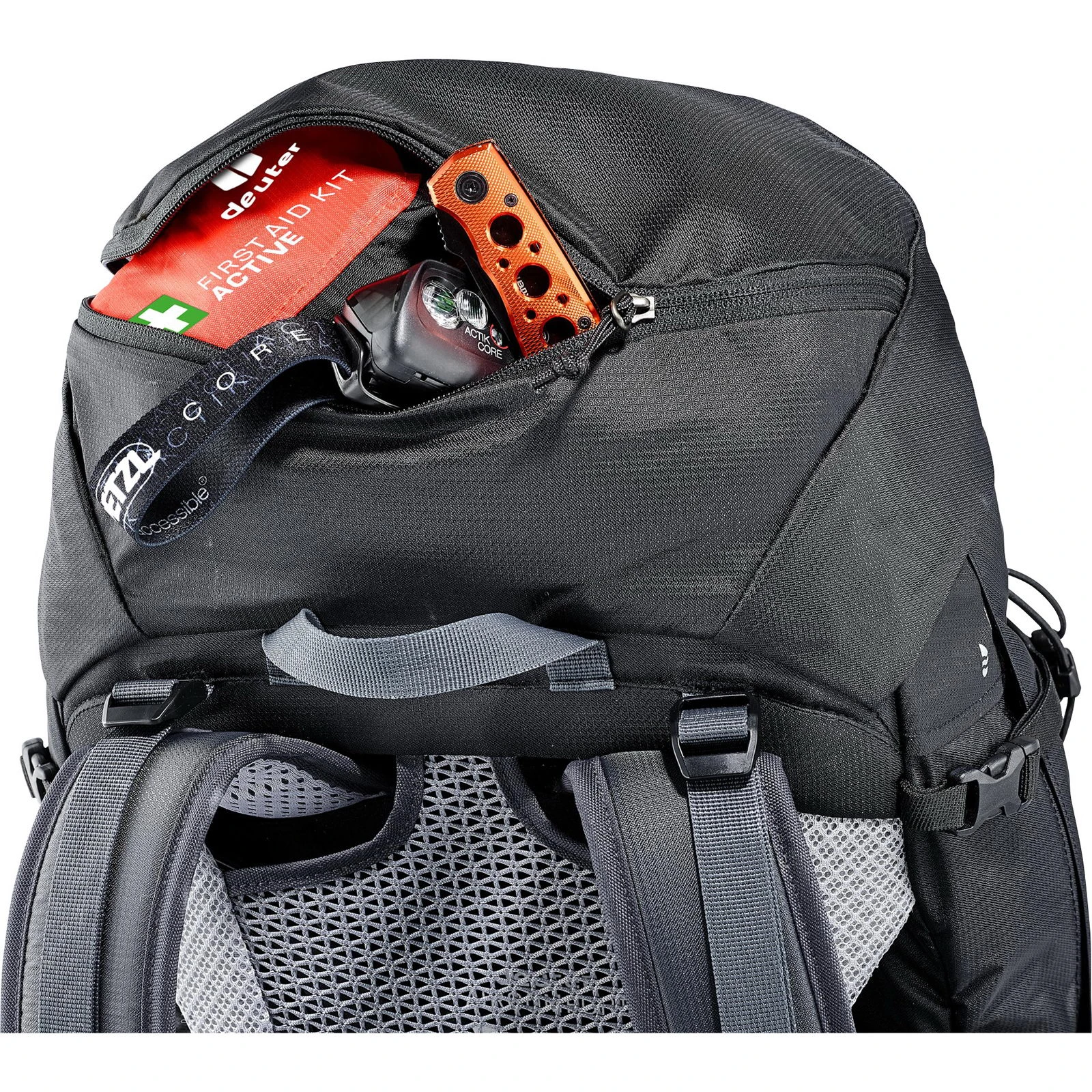 | Befestigungsmöglichkeiten | Helmnetz (als Zubehör erhältlich), Materialschlaufe, Pickel, Stöcke, Trinkflasche |