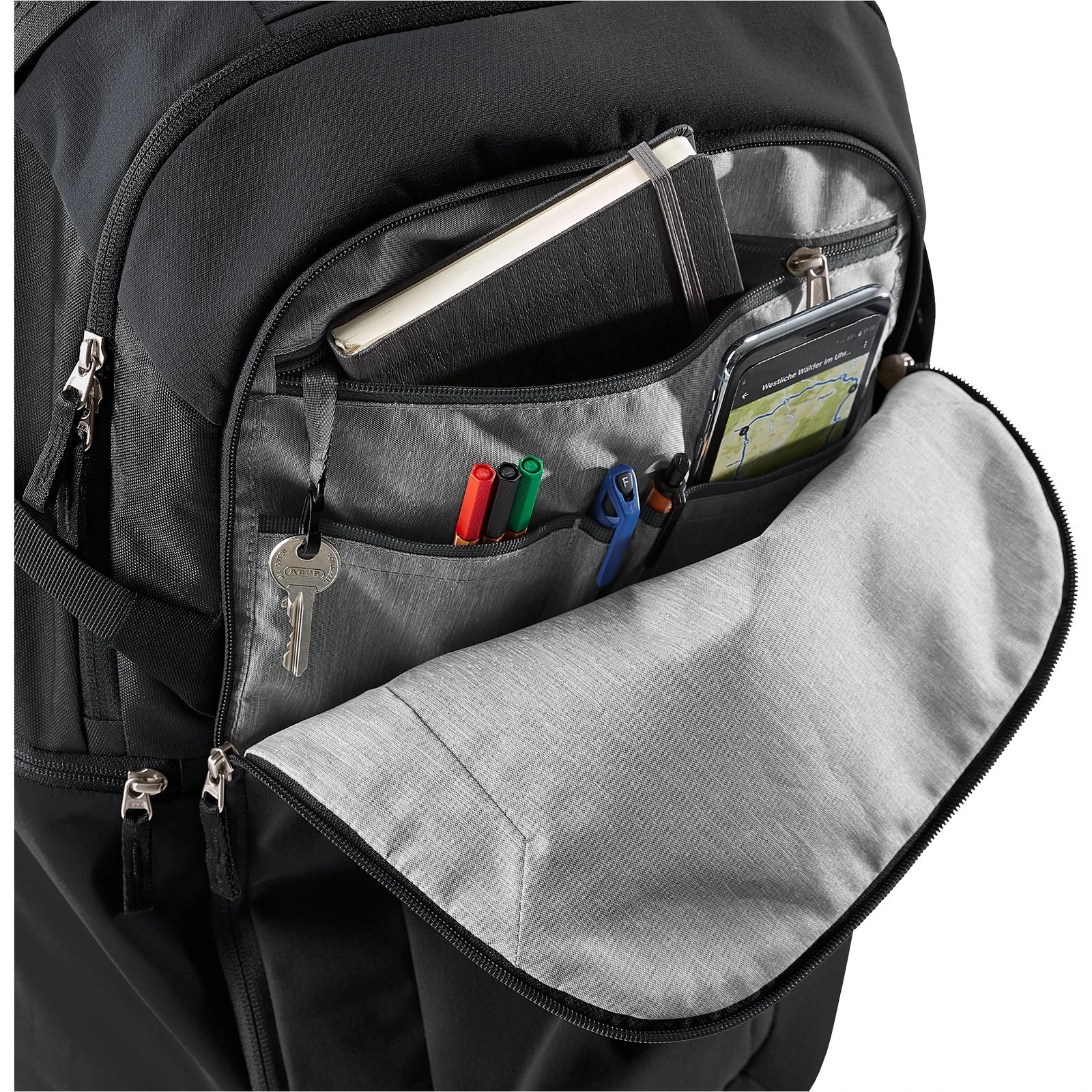| Merkmale | abnehmbarer Hüftgurt, eine elastische Seitentasche, eine Seitentasche mit Reißverschluss, Frontfach mit Organizer und Reißverschlusstasche, gepolsterter Boden, gepolstertes Laptopfach mit separatem Reißverschluss und Einschubfach innen, großes Hauptfach (Ordnertauglich) mit integriertem Einschubfach, höhenverstellbarer Brustgurt, Lastkontrollriemen, Schlüsselhalterung, seitliche Kompressionsriemen, Tragegriff oben |