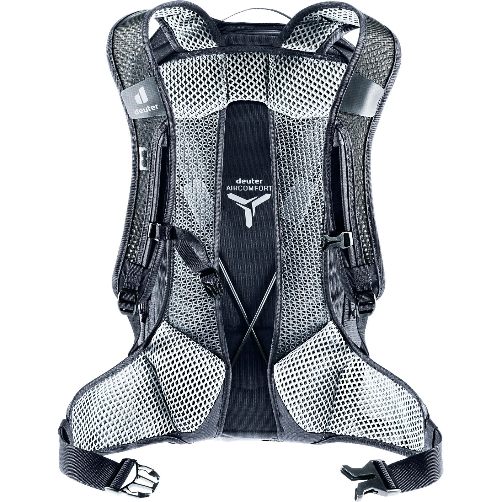 Der Race Air 14+3 von deuter ist ein extrem leichter, stabiler Bike-Rucksack mit hervorragendem Gewichts-Komfort-Verhältnis. Dank der dreiseitigen Belüftung und der kompakten Passform durch ergonomisch geschnittene Netz-Schulterträger und -Hüftflossen macht der Race Air 14+3 auch auf schweißtreibenden Strecken Spaß. Maximale Belüftung, Bewegungsfreiheit und Leichtigkeit vereint das bikespezifische Aircomfort Netzrücken-System dank der biegsamen Rahmen-Konstruktion. Flexibel folgt der dauerhaft elastische, bruchfeste Federstahlrahmen den Bewegungen des Trägers. Gleichzeitig hält er das Rückennetz in dauerhaft stabiler Spannung und schafft einen Ventilationsraum zwischen Rucksack und Rücken, damit feuchte Luft ungehindert entweichen kann. Der Fahrradrucksack verfügt über ein großes Hauptfach mit Einschubfach zum Verstauen nasser Kleidung oder einer Trinkblase und ein Frontfach mit Reißverschluss-Netztasche und Organizer für Wertsachen, Schlauch, Werkzeug und Pumpe. Dank der Volumenerweiterung mittels Reißverschlussbag lässt sich das Hauptfach um 3 Liter Packvolumen erweitern. Zwei elastische Seitentaschen bieten Platz für die Trinkflasche und ein seitliches Reißverschlussfach für das Handy. In zwei separaten Reißverschlusstasche am Boden befinden sich eine passende Helmhalterung und eine Regenhülle. Eine Brillenhalterung am Schultergurt und reflektierende Elemente für mehr Sichtbarkeit im Straßenverkehr runden den Bike-Rucksack ab.