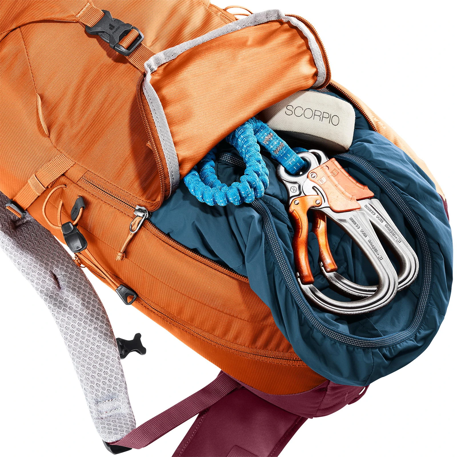 | Befestigungsmöglichkeiten | Helmnetz (als Zubehör erhältlich), Materialschlaufe, Pickel, Stöcke, Trinkflasche |