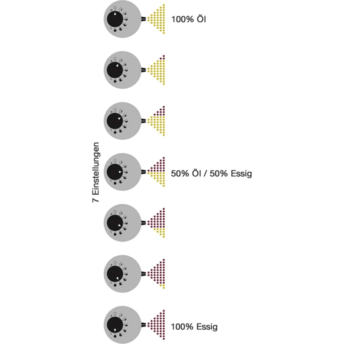 Mit dem Essig & Öl Spender bzw. Mixer haben Sie immer die passende Mischung zur Hand. Essig und Öl werden jeweils in einen separaten Teil der Flasche gefüllt (dazu einfach den Dosierkopf abziehen, pro Kammer stehen 100 ml zur Verfügung) und anschließend kann die gewünschte Menge mittels Drehrad eingestellt werden. Entweder nur Öl, nur Essig, halb und halb oder auch ganz anders. Pro Dosiervorgang kommen 5 ml in der gewünschten Menge aus dem Spender, er arbeitet auch bei unterschiedlichen Konsistenzen zuverlässig (zum Beipiel bei Crema Balsamico, etc.) die Flasche besteht aus PET und ist Lebensmittelecht. Sieben verschiedene Stufen stehen zur Verfügung. Der DUETTOMIX BLACK eignet sich nicht nur für die Campingküche (er kann am Drehrad auch geschlossen werden), auch zu Hause, auf Arbeit und und und findet er praktische Anwendung.
