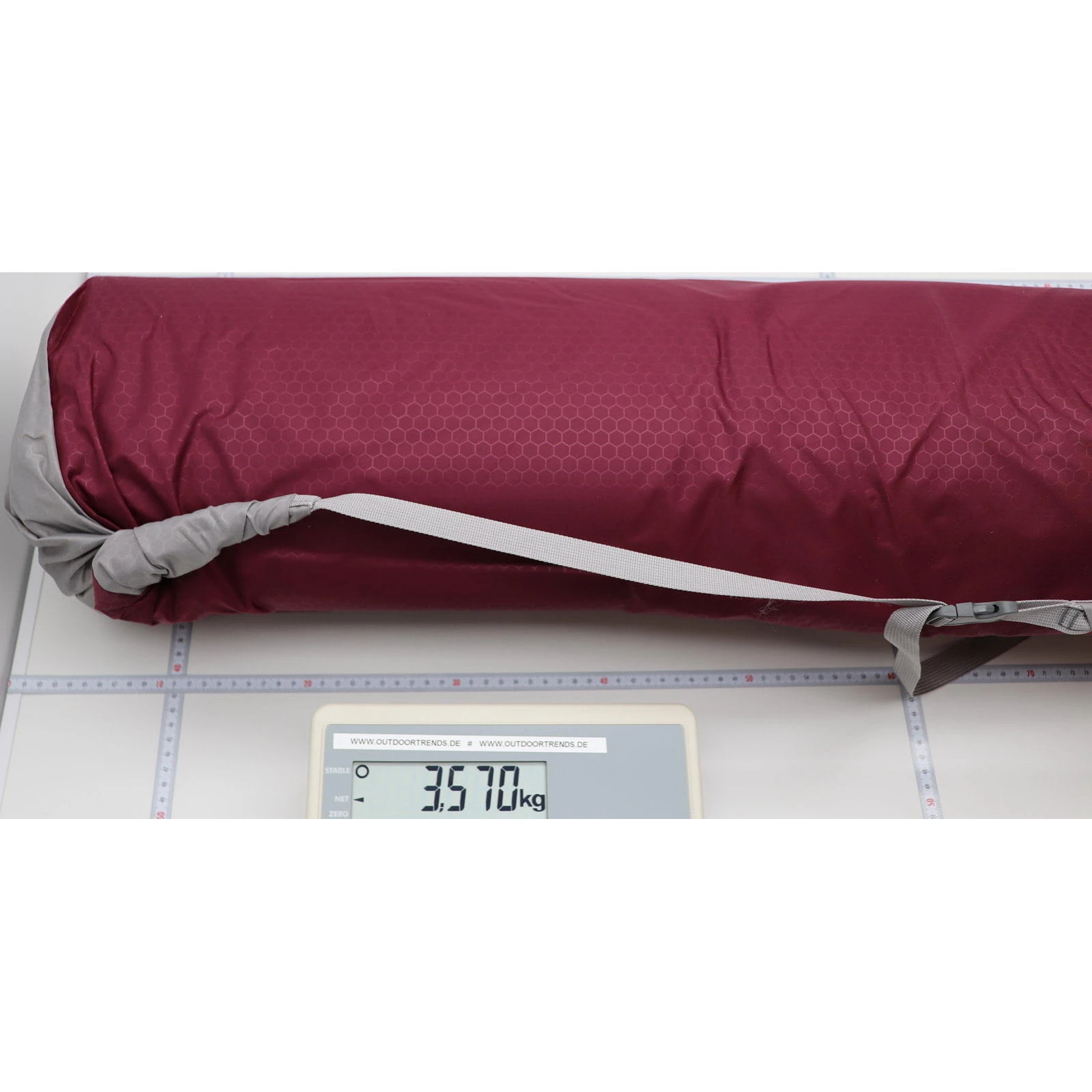 | Material | unten: 100% Polyester (75D, TPU Polyether Film Laminat, hydrolyseresistent, Oeko-Tex® 100 zertifiziert, DWR-frei), oben: 100% Nylon (50D, TPU Polyether Film laminiert, hydrolyseresistent, Wabenstruktur geprägt, Oeko-Tex® 100 zertifiziert, DWR-frei), Isolation: 100% Polyurethan (16 kg/m³, Schaum, Oeko-Tex® 100 zertifiziert) |