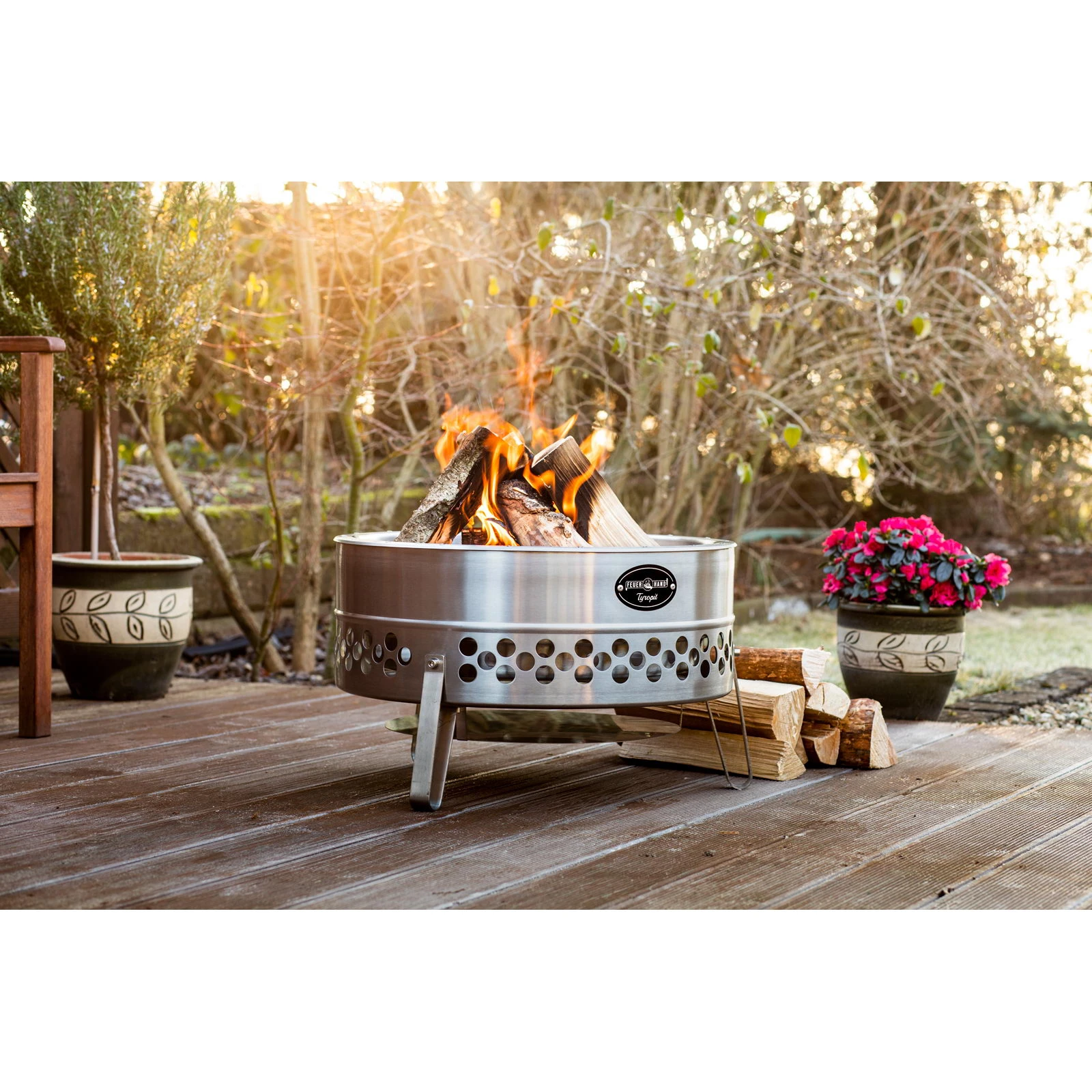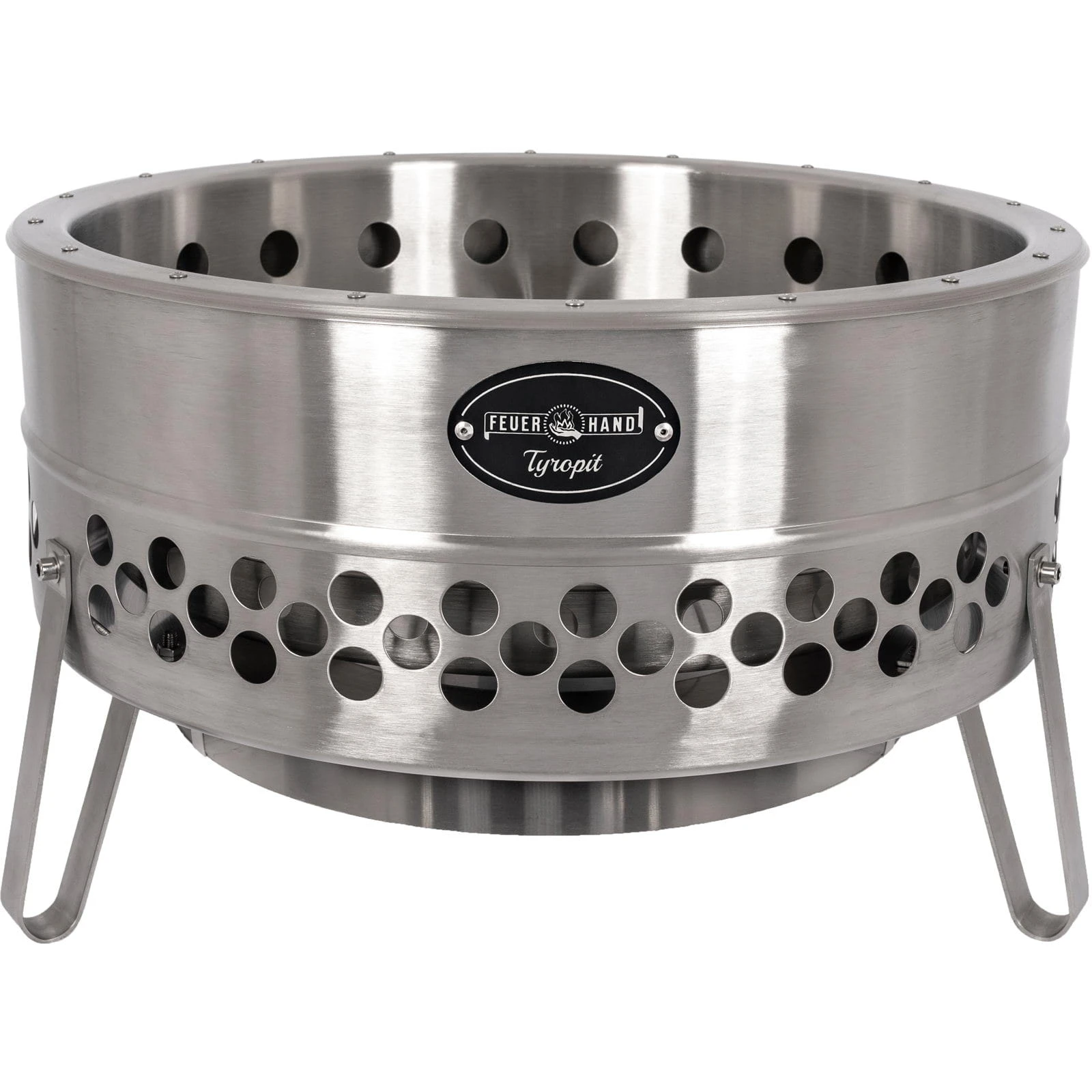 Gemütliche Stunden zu Hause bei entspannter Atmosphäre garantiert: Die Feuerhand Feuerschale Tyropit liefert zuverlässig Licht und Wärme und bringt das Knistern in jede Terrassenrunde. Die doppelwandige Feuerschale aus Edelstahl eignet sich hervorragend, um gesellige Abende mit Familie oder Freunden bei Stockbrot und Würstchen am Spieß zu verbringen. Mit einer Standhöhe von etwa 35 cm hat der Tyropit die ideale Größe, um sich gemeinsam rund um die Feuerschale zu versammeln. Zudem wärmt die Feuerschale von Feuerhand nicht nur auf angenehmer Höhe, sondern besticht auch durch ihre geschmackvolle Ausgestaltung im zeitlosen Industriechic. Die aus der Feuerhand Entwicklung stammende Tyropit ist die perfekte Symbiose aus Form und Funktion. Mit ihr wird das Prinzip der Feuerschale neu definiert und ansprechend verpackt: Konstante Luftzufuhr von unten sowie die zusätzliche Sauerstoffzuführung durch den doppelwandigen Korpus erzeugen eine effektive Holzverbrennung. Die entstehende Sekundärverbrennung sorgt für einen ruß- und raucharmen Betrieb. Die Luftzufuhr in der Mitte deines Terrassenfeuers versorgt die Flammen zusätzlich mit Sauerstoff. So können die Gäste anregenden Gespräche bei wohligem Ambiente folgen. Die Glut wird auf dem herausnehmbaren Kohlerost zusammengehalten, während Verbrennungsrückstände in der ebenfalls entfernbaren Ascheschale mit Funkendom aufgefangen werden. Dadurch bleibt das Feuer am Knistern und die Kaminstimmung für den Garten garantiert. Der Funkendom verhindert zudem das Herausfallen von Glut oder Funken und ein Hitzeschild am Boden schont den Untergrund. Auf drei Standbeinen ruhend steht die Tyropit stabil und kippsicher. Der Edelstahlkorpus ist dabei nicht nur besonders robust und hitzebeständig, sondern bildet mit der Zeit eine charmante Patina aus. Diese Materialverfärbung ist normal und abhängig von Hitzegrad, Befüllung und Art des Brennmaterials. Verbrennungsrückstände fallen automatisch in die Ascheschale mit integriertem Funkendom herab und werden dort sicher und sauber aufgefangen. Nach dem Betrieb und Auskühlen des Tyropit wird der Kohlerost herausgenommen und die abgekühlte Asche kann so einfach entfernt werden. Die restlichen Bestandteile werden danach mit einem Handfeger gesäubert und die Feuerhand Tyropit ist bereit, um die nächste Gartenparty in stimmungsvollem Licht zu erhellen.