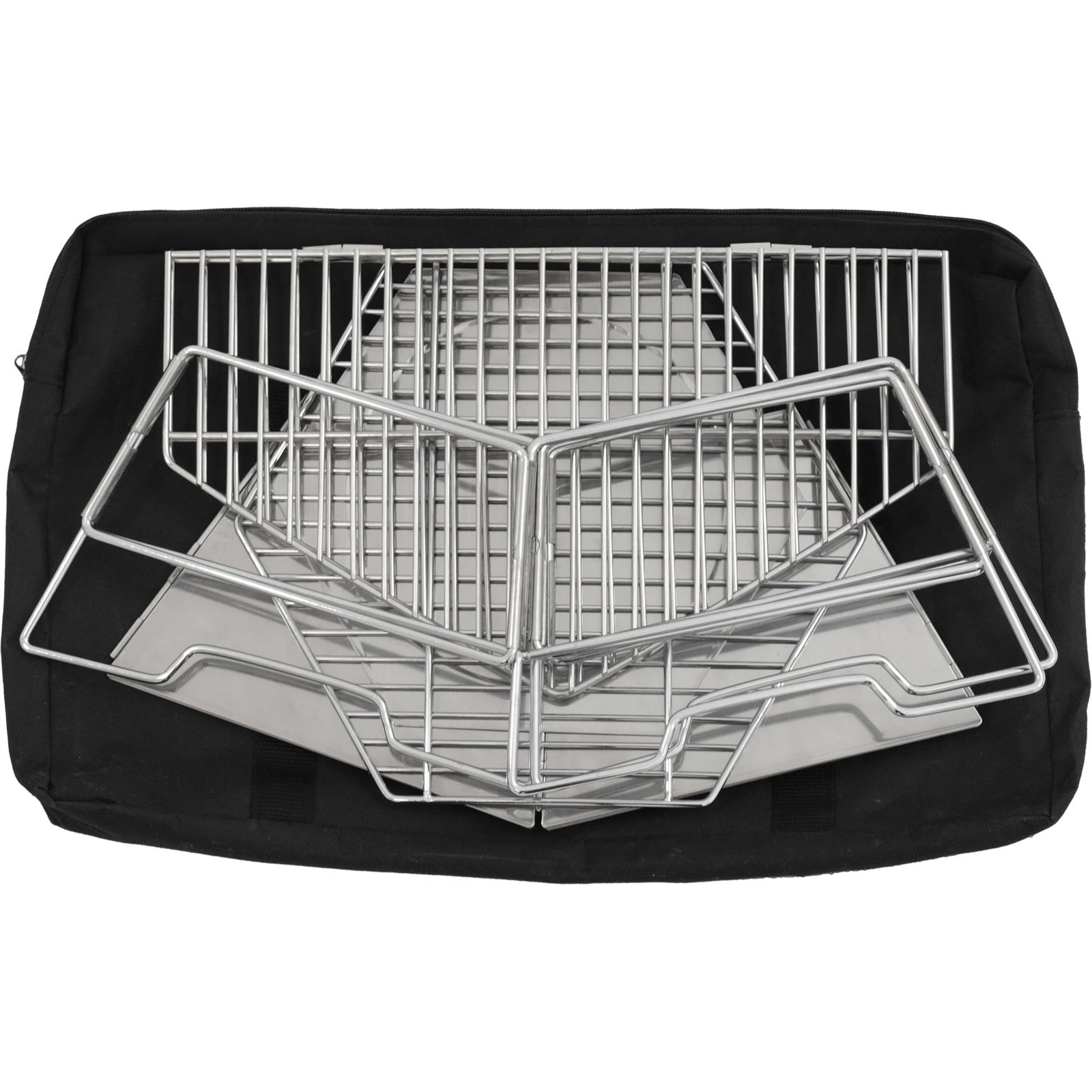 Der Hexagon von Origin Outdoors ist ein kompakter und praktischer Grill mit großer Grillfläche. Die sechseckige, zusammenfaltbare Bauweise begünstigt das kompakte Packmaß, ermöglicht einen schnell Auf- und Abbau und steht stabil am Boden. Durch seine Bauweise ist er auch als Feuerschale verwendbar. Weiterhin verfügt der Grill über eine einlegbare Bodenplatte, einen Kohlerost und einen großen, mittig zusammenklappbaren, Grillrost. Die faltbaren Wandsegmente sind wie ein Windschutz konstruiert und schützen die Glut vor starkem Wind. Die in den Wandsegmenten eingearbeiteten Luftlöcher befinden sich unterhalb des Kohlerosts und versorgen die Glut so perfekt mit Sauerstoff. Die Tragetasche aus Nylon ist im Lieferumfang enthalten.