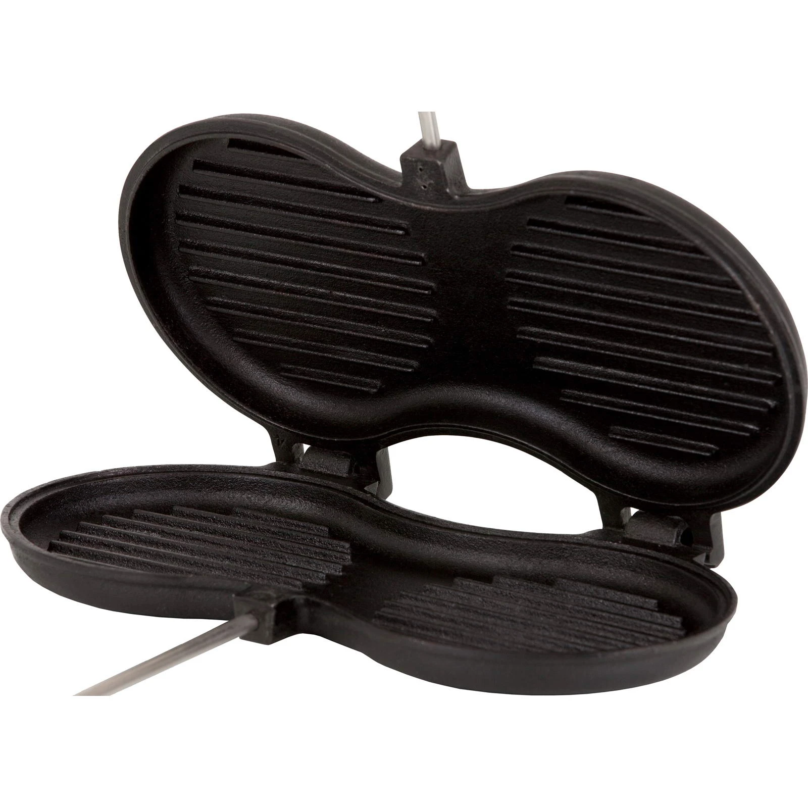 Mit dem Burgereisen von Petromax kann man in den runden Formen mit je zwölf Zentimetern Durchmesser perfekte Burger Patties direkt im Feuer braten. Dank der gerillten Oberfläche bekommen sie das typische Grillmuster. Durch die wärmespeichernden Eigenschaften der gusseisernen Form werden die Burger Patties in den Flammen oder der Glut scharf angebraten und können anschließend mit der Resthitze perfekt gegart werden. Dank der abgeflachten, aufliegenden Holzgriffe und des Verschlusshakens kann man das Burgereisen sicher verschließen und halten. Zum Reinigen können die beiden Formen über das Scharnier einfach voneinander getrennt und einzeln gesäubert werden.