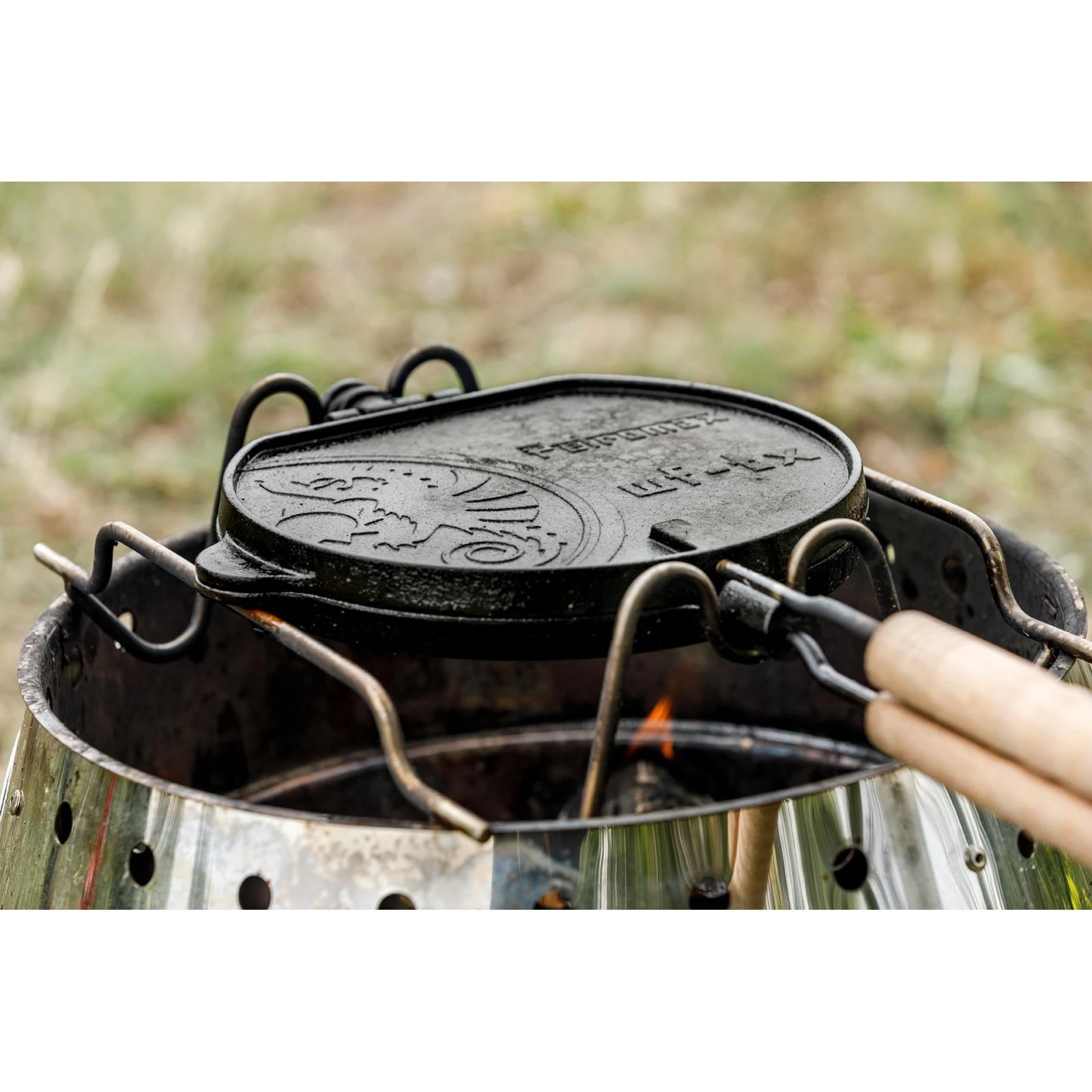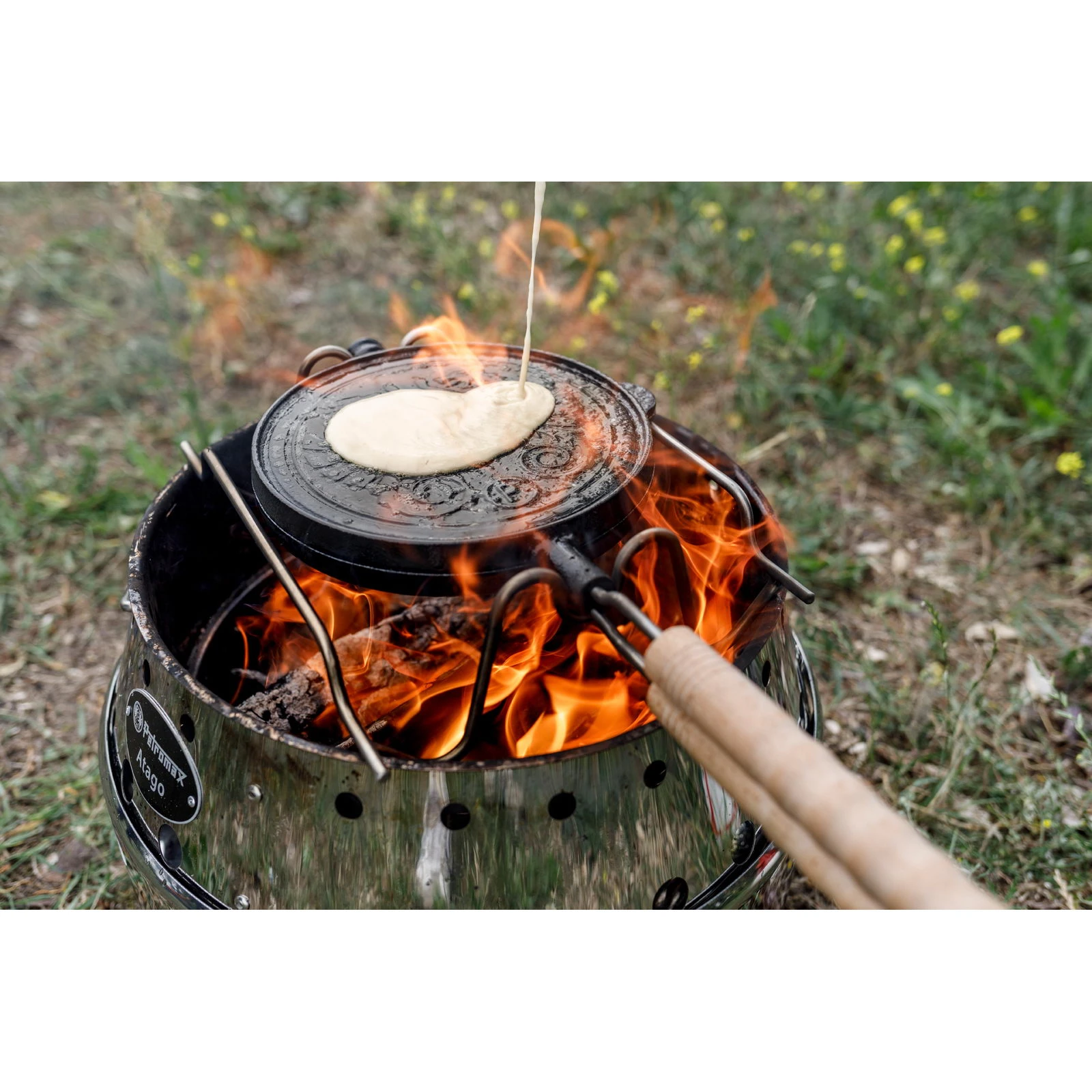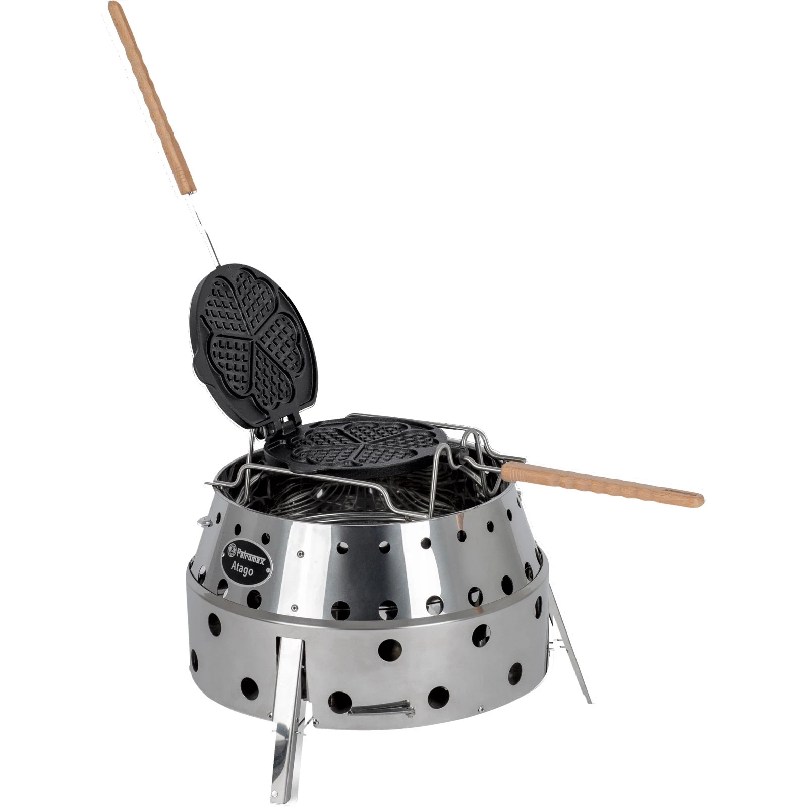 Das Wende-Waffeleisen ist eine gusseiserne Form von Petromax, mit der man sowohl herzhafte als auch süße Waffeln im Handumdrehen zubereiten kann. Mit dem dazugehörigen Auflagegestell erhält man eine passgenaue Grundlage, auf der man das Waffeleisen kippsicher und rutschfest auflegen kann. Die Waffelgussform besteht aus zwei Teilen, die durch ein Scharnier miteinander verbunden sind. Vorgeformte Einkerbungen verschaffen der gusseisernen Form eine feste Position im Gestell. Durch den Verschlussmechanismus wird das Eisen zusammengehalten und bleibt auch während des Wendevorgangs sicher verschlossen: So fließt dein Waffelteig nicht aus der Form. Mit Hilfe der naturbelassenen Holzgriffe kann man das Wende-Waffeleisen auch bei höheren Temperaturen problemlos mit einem Handgriff drehen. Die an der Seite langgeführte Gussnase bildet den Wendeanschlagpunkt am Auflagegestell. Dadurch lässt sich das Eisen um 180° drehen und erreicht anschließend wieder den richtigen Auflagepunkt am Gestell. Mit dem Wende-Waffeleisen geht das Zubereiten frischer Herzwaffeln leicht von der Hand. Dabei musst man auf den charakteristischen Geschmack, den traditionelles Kochen mit Gusseisen mit sich bringt, nicht verzichten. Wenn ein feuriges Drachen-Brandzeichen voll und ganz nach ihrem Geschmack ist, dann ist die drachenstarke Doppelfunktion vom Wendewaffeleisen genau das richtige für sie. Denn wo innen luftige Waffeln backen, ist auf der Außenseite mit großformatigem Drachenlogo-Druck auch das Backen von dünnen Pfannkuchen oder Teigfladen mit einen drachenstarken Logo-Abdruck möglich. Platz da: Zum Wenden benötigt das Wende-Waffeleisen ausreichend Spielraum. Daher ist es wichtig, dass das Auflagegestell etwas erhöht positioniert wird und zur Mitte hin genügend Platz nach unten gegeben ist. Bestenfalls beträgt dieser mindestens den Durchmesser des Waffeleisens. Das ist notwendig, damit man das Eisen frei bewegen kann und das Wenden auch reibungslos vonstatten geht. Eine ideale Draußen-Kochstelle, um das Wende-Waffeleisen zum Einsatz zu bringen, ist der Atago: Das Gestell des Waffeleisens passt optimal auf den oberen Rand. Gleichzeitig ist die Distanz zwischen dem Auflagegestell und dem Kohlerost groß genug, um die Waffeln mit indirekter Hitze backen zu können. Dadurch erzielt man beste Ergebnisse und hat ausreichend Abstand für geschickte Wendemanöver.