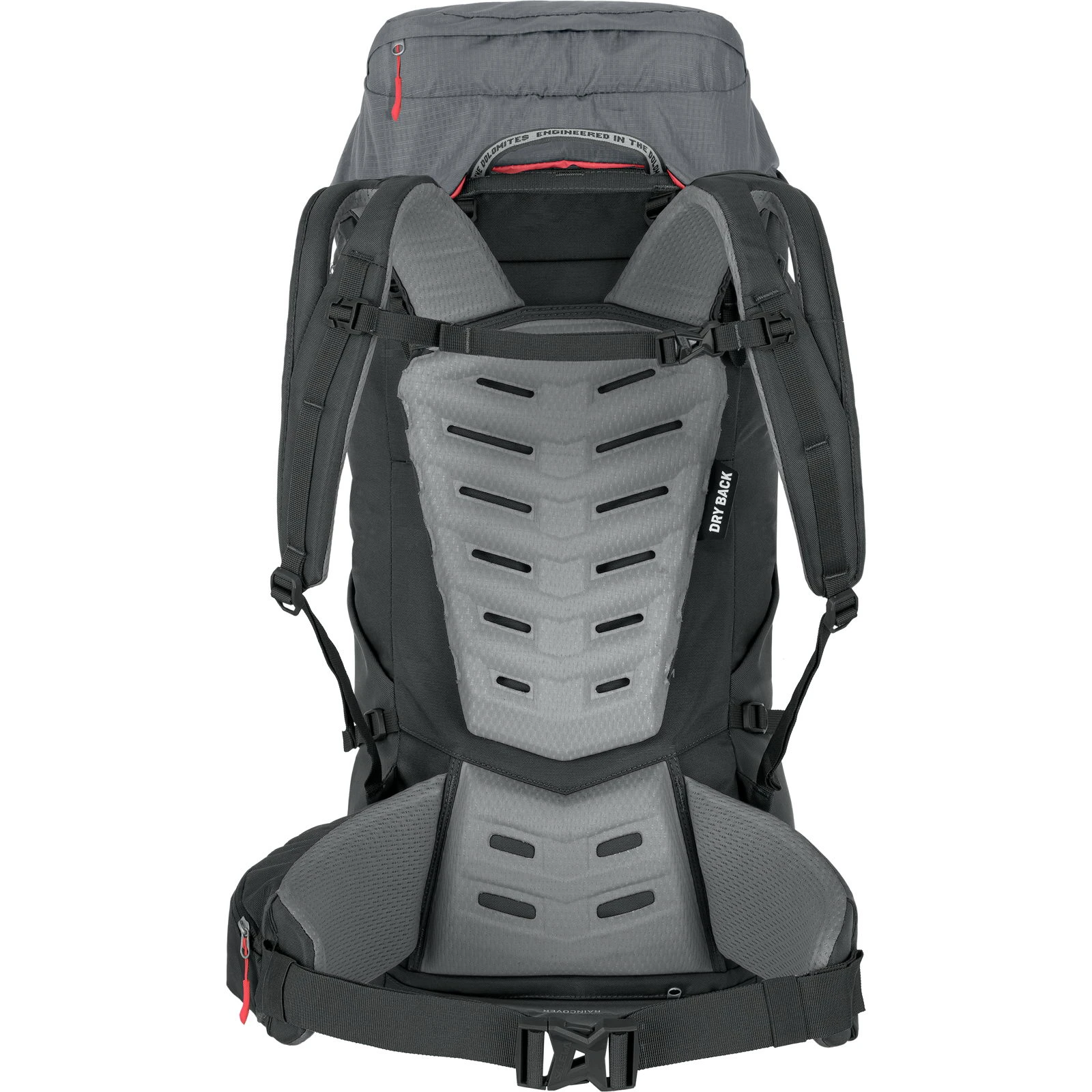 Der Trek Mate 50+5 W von Salewa für Damen ist ein ein großer, komfortabler Trekkingrucksack mit verstellbarem Tragesystem und perfekt für ausgedehnte Bergwanderungen und mehrtägige alpine Trekkingtouren. Das individuell und leicht anpassbare Dry Back Custom Tragesystem verfügt über eine verstellbare Rückenlänge sowie anatomisch geformte und gepolsterte Schulter- und Hüftgurte und eine Lendenwirbelstütze für eine individualisierte Passform. Zusätzlich ermöglichen Lastkontrollriemen einen optimalen Sitz am Rücken auf langen Strecken. Vorgeformte Hüftflossen garantieren, dass der Hüftgurt perfekt anliegt und das Gewicht gut auf die Hüften verteilt wird. Das luftdurchlässige Dry BackTragesystem bietet hervorragende Belüftung und zusammen mit den Lüftungskanälen der EVA Polsterung hält es den Rücken angenehm trocken. Die geteilten Schulterriemen lassen auch weite Streckbewegungen zu und sorgen für mehr Bewegungsfreiheit. Der Zugang zum Hauptfach ist sowohl von oben als auch über die seitliche Reißverschlussöffnung und das Bodenfach möglich, sodass man schnell an den gesuchten Rucksackinhalt kommt. Wenn man mehr Ausrüstung verstauen muss, gibt es die Möglichkeit, den 50-Liter-Rucksack mit dem höhenverstellbaren Deckel um zusätzliche 5 Liter Stauraum zu vergrößern. Der Damen-Wanderrucksack verfügt über zwei Reißverschluss-Deckelfächer für Wertgegenstände, ein großes Frontfach mit Reißverschluss und diverse außenliegende Befestigungsmöglichkeiten für Trekkingstöcke, Trinkflaschen, Seil und andere Ausrüstungsgegenstände. Praktische Daisy-Chain-Schlaufen und zusätzliche Kompressionsriemen können z.B. zum Befestigen einer Isomatte an der Außenseite des Rucksacks genutzt werden. Der Trek Mate 50+5 W ist außerdem mit Trinksystemen kompatibel und wird mit passender Regenhülle geliefert.