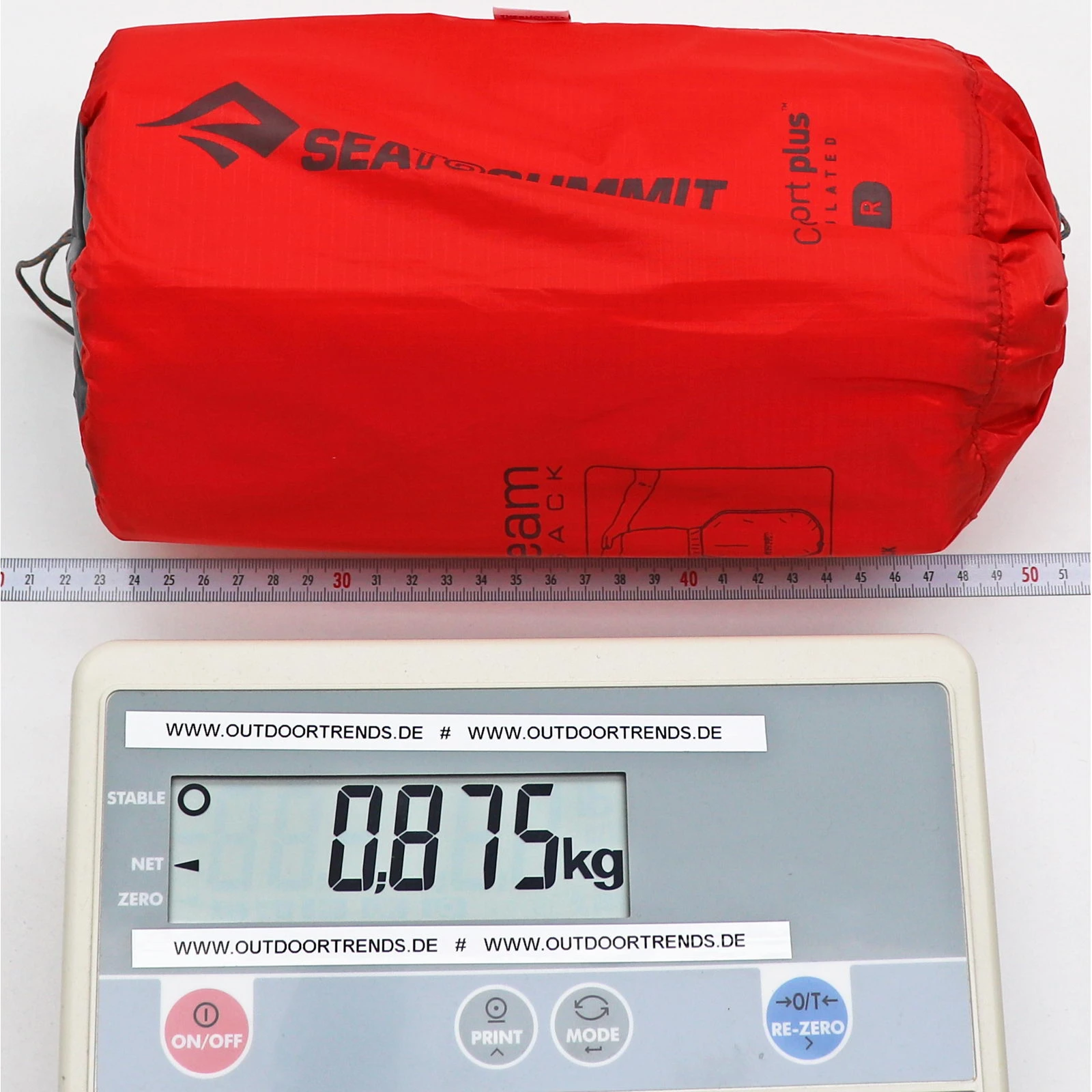 Die Schlafmatte Comfort Plus Insulated Mat von Sea to Summit gehört zu einer komplett neu entwickelten Mattengeneration. Sie ist nicht die leichteste oder kompakteste Matte auf dem Markt, dafür garantiert sie wirklich erholsamen Schlaf. Laut Sea to Summit sind es die bequemsten Matten auf dem Markt (sicherlich immer auf Größe und Dicke bezogen) und auch wir konnten uns schon vom Schlafkomfort überzeugen. Unserer Meinung nach einer der besten Matten! Mit das wichtigste an der Comfort Plus Insulated Mat ist die Air Sprung Cell Technologie. Statt der sonst üblichen Trennwandkonstruktion wird hier eine punktgeschweißte Konstruktion aus ineinander verbundenen Kammern verwendet welche eine großflächige Matrix bildet. Die Kammern nennt Sea to Summit Air Sprung Cell und sie funktionieren wie eine Taschenfederkern-Matratze: jede Kammer kann sich so verformen wie es benötigt wird. Damit passt sie sich hervorragend dem Körper an und sorgt für eine bessere Druckverteilung. Stützt man sich zum Beispiel mit dem Ellenbogen auf, wird die Matte nur an dieser Stelle verformt. Neben der Air Sprung Technologie bietet die Comfort Plus Insulated Mat wie der Name es schon verrät eine Isolierung aus ThermoLite HL-1. In Kombination mit dem geräuschlosen Exkin Platinium Material (ist ein superleichtes, mit metallener Oberfläche versehenes Reflektionsmaterial) bietet die Insluated Version ein Plus beim R-Wert und damit mehr Schutz von unten. Die Comfort Plus Serie hat gleich zwei Lagen der Air Sprung Cell’s: die komplette double-layer Konstruktion sorgt für maximalen Komfort. Beide Lagen können separat voneinander aufgeblasen werden. So können Sie die Unterseite härter wählen, um Unebenheiten des Bodens auszugleichen, die Oberseite füllen Sie ganz nach Ihren Vorlieben und haben so ein super bequeme Schlafunterlage. Um das Aufblasen und Entlüften zu erleichtern, hat Sea to Summit ein multifunktionelles 3in1 Ventil entwickelt: Durch die erste, große Öffnung kann die Matte schnell aufgeblasen werden ohne dabei Luft entweichen zu lassen. Drückt man mit dem Finger etwas dagegen, kann Luft dosiert abgelassen werden um den optimalen Innendruck zu erhalten. Öffnet man beide, so kann die Luft schnell entweichen und die Schlafmatte lässt sich schneller zusammenpacken. Für die Oberfläche verwendet Sea to Summit ein 40D Nylon Ripstop Material, welches außen mit einem TPU Film versehen ist. Dadurch ist die Matte leise, rutschhemmend und dank mitgeliefertem Repair Kit schnell geflickt wenn notwendig. Außerdem dabei: ein Packsack mit dem sich die Matte aufblasen lässt.