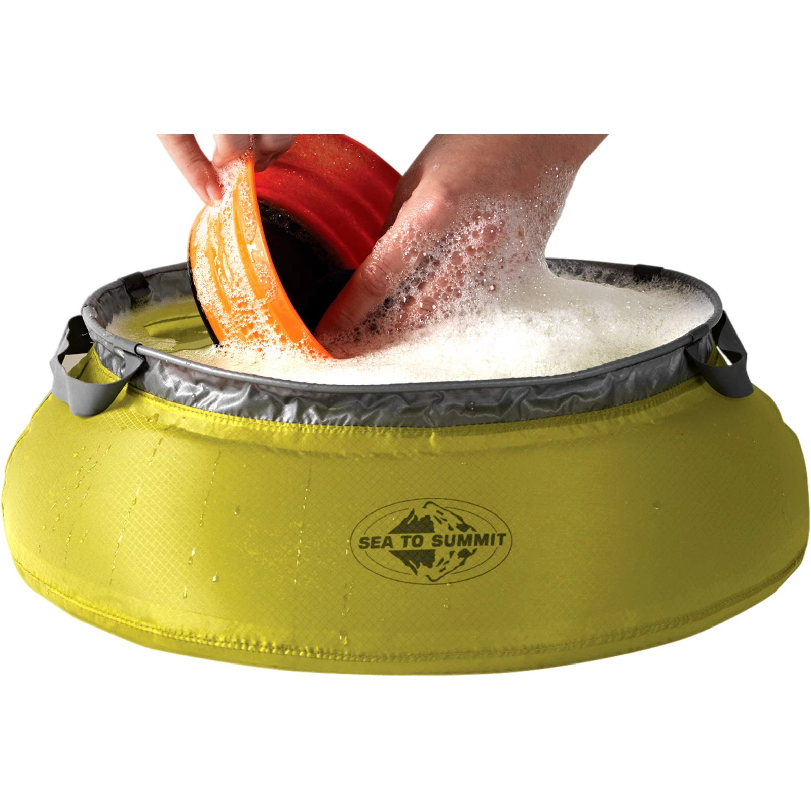Wasch-Schüssel Ultra-Sil Kitchen Sink mit 10 Liter Volumen von Sea to Summit. Faltbare Schüssel für die Campingküche , extrem leicht aber dennoch im gefüllten Zustand freistehend.