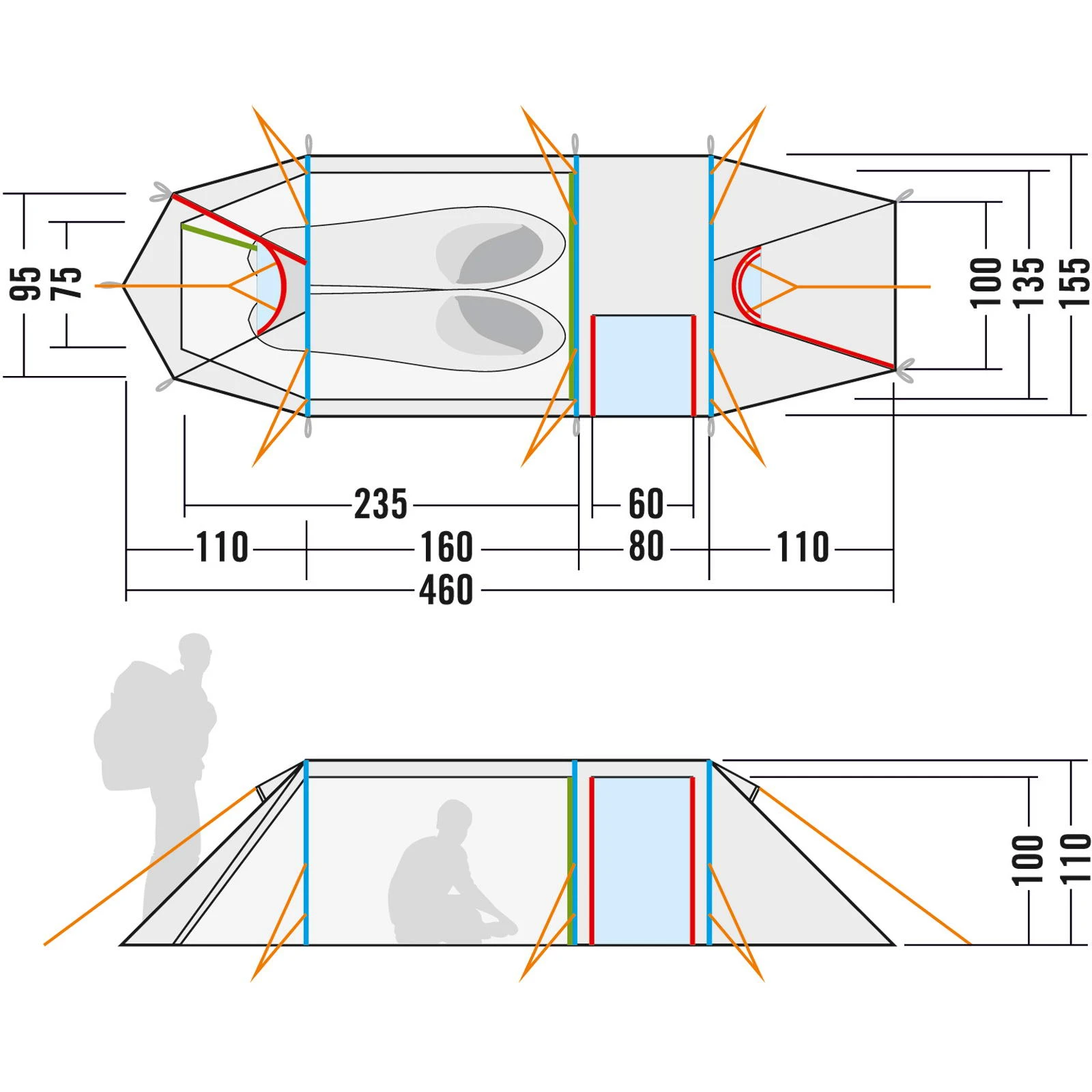Merkmale: Tunnelzelt mit drei Gestängebögen und Apside; Himmeltasche; Herausnehmbare Tasche in der Apside; Seitlicher Eingang in die Apside mit separat verschließbarem Moskitonetz; Drei Eingänge in das Außenzelt; Zwei Lüfter im Außenzelt; Wasserdicht versiegelte Nähte; Wasserdichte Verarbeitung der Abdeckungen, Lüfter und Ansatzpunkte; Reflektierende Zeltleinen; Praktische Packhilfe für Zeltleinen; Verstärkte Eckpunkte mit Gurtbandschlaufen; Extra langes Innenzelt (235 cm) für mehr Liegekomfort; Zwei Eingänge in das Innenzelt, einer davon mit separat verschließbarem Moskitofenster; Zwei Einstecktaschen im Innenzelt neben dem Eingang; Bequeme Einstecktasche in Greifhöhe am Fußende; Wäscheleine im Innenzelt; Lüfter im Innenzelt; Eloxiertes Aluminium-Zeltgestänge; Inklusive Packsäcke für Zelt und Gestänge