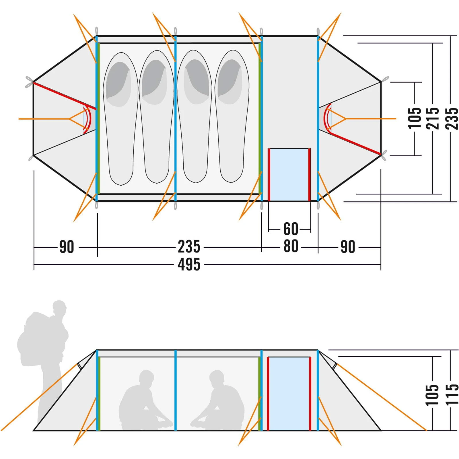 Merkmale: ; Klassisches Tunnelzelt mit vier Gestängebögen und Apside; Himmeltasche; Herausnehmbare Tasche in der Apside; Zelt und Innenzelt von beiden Apsiden-Seiten betretbar; Seitlicher Eingang in die Apside mit separat verschließbarem Moskitonetz; Drei Eingänge in das Außenzelt; Zwei Lüfter im Außenzelt; Wasserdicht versiegelte Nähte; Wasserdichte Verarbeitung der Abdeckungen, Lüfter und Ansatzpunkte; Reflektierende Zeltleinen; Praktische Packhilfe für Zeltleinen; Verstärkte Eckpunkte mit Gurtbandschlaufen; Zwei Eingänge in das Innenzelt mit separat verschließbaren Moskitofenstern; Vier Einstecktaschen im Innenzelt; Wäscheleine im Innenzelt; Eloxiertes Aluminium-Zeltgestänge; Inklusive Packsäcke für Zelt und Gestänge