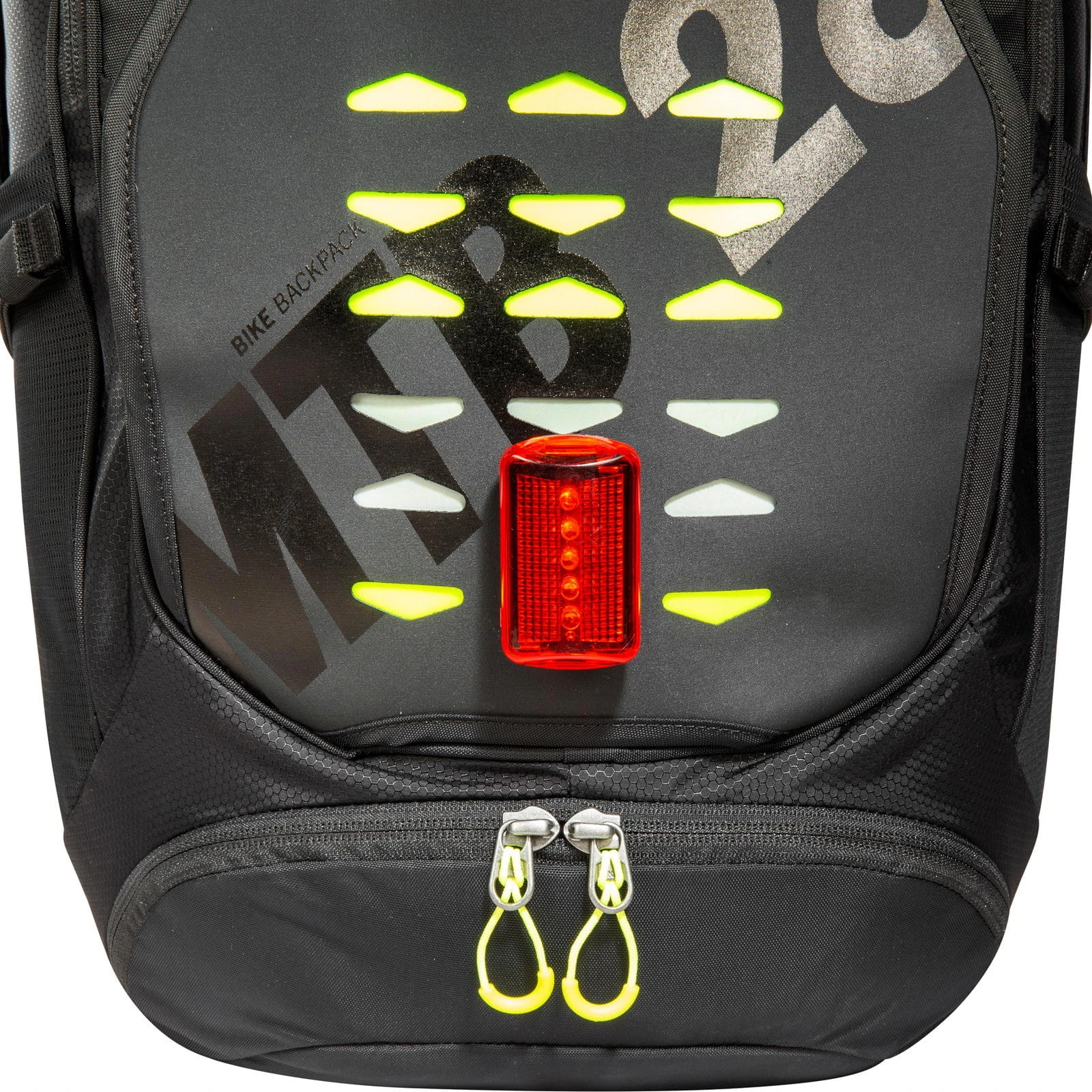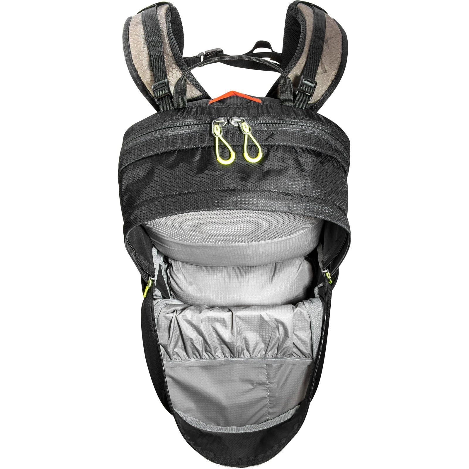 | Merkmale | Bodenfach mit separatem Zugang von außen, elastische Reißverschlusstasche auf einem Hüftflügel, erweiterbares, elastisches Einschubfach vorne (für Helm geeignet), Fach vor dem Hauptfach mit Einschubfächern, Klettschlaufen, Schlüsselhalterung und zwei Reißverschlussfächern, Halterung für Trinkblase, Hauptfach eins mit Einschub- und Reißverschlussfach, Hauptfach zwei mit zwei Einschubfächern (eines für Laptop geeignet), höhenverstellbarer Brustgurt, integrierte Regenhülle in separater Reißverschlusstasche am Boden, Lastkontrollriemen, Materialschlaufen auf den Schulterträgern für Brille etc., reflektierende Elemente, Schlauchdurchführung für Trinksystem, seitliche Kompressionsriemen, Trageschlaufe hinten oben, Zwischenboden zwischen Bodenfach und Hauptfach kann geöffnet werden |