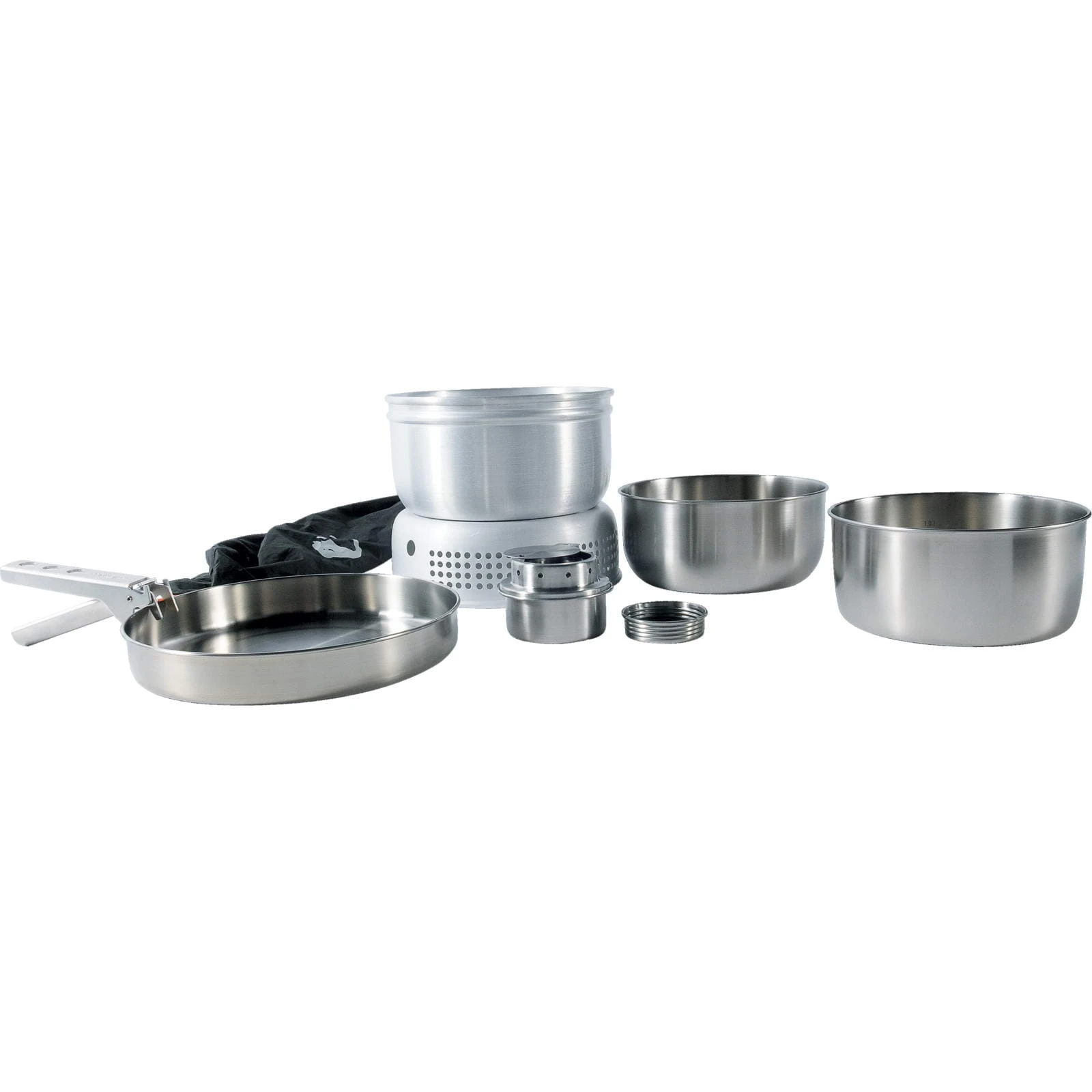 Auf diese Weise hat man viele Eisen im Feuer: Das Set in der Regular-Ausführung setzt sich aus Pfanne, kleinem Topf, großem Topf, Kochgestell, Brenner, Windschutz und Handgriff zusammen. Ein Kochkomplettset sozusagen.