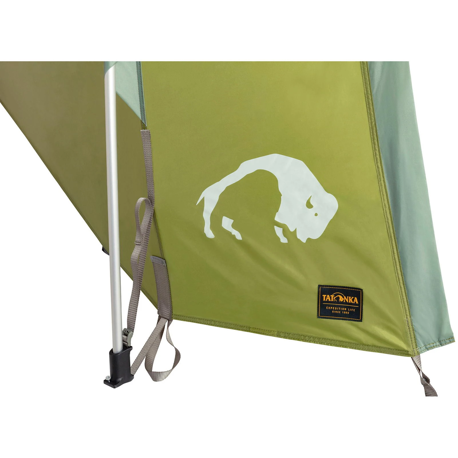 Das Van Camp Basic von Tatonka ist ein selbststehendes Vorzelt mit Frontzugang und Kederbefestigung für den Anbau an verschiedenen Campingbusse. Das stehhohe Vorzelt mit Tunnelkonstruktion wird mit zwei Gestängebögen aufgestellt und mit einem abnehmbaren Keder in die Kederschiene des Busses eingezogen. Der Doppelkeder mit zwei unterschiedlichen Durchmessern (3,5 und 7 mm) ermöglicht die Befestigung der Schleuse an den gängigen Fahrzeugtypen wie Transporter, Vans oder Campingmobile. Die Kederbefestigung kann auch vom aufgestellten Zelt abzippt werden, so dass das Zelt auch alleine stehen bleiben kann, während man mit dem Bus wegfährt. Das Van Camp Basic verfügt über einen Fronteingang mit Doppelreißverschluss, der aufgerollt, als Sonnendach aufspannt und mit einem separaten Moskitonetz verschlossen werden kann. Der in der Rückwand befindliche Eingang in den Bus ist ebenfalls mit einem Reißverschluss verschließbar. Das Vorzelt besteht aus vierfach PU-beschichtetem Polyester, ist wasserdicht mit einer Wassersäule von 8.000 mm, UV-beständig und farbecht. Die Gestängebögen sind aus bruchsicherem Aluminium. Das Van Camp Basic wird zusätzlich mit 12 Standard-Heringen, 4 Abspannleinen und einer praktischen Packtasche mit umlaufendem Reißverschluss und stabilen Tragegurten geliefert.