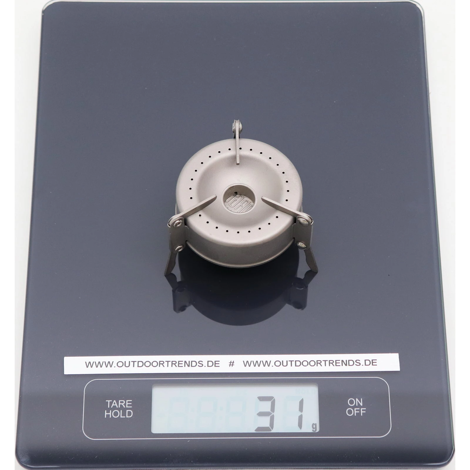 Aus ultraleichtem, hochwertigem Titan hergestellt bietet der Vargo ‘Triad’ den Freunden des Minimalismus einen neuen Rekord. Die Füße und Topfauflagen des Kochers sind ausklappbar und bieten einem kleinen Topf ausreichend Standfestigkeit. Auf weichem Untergrund können die Füße einfach in den Boden gesteckt werden. Mit einer Füllung Spiritus brennt der Kocher ca. 20 Minuten. Zum Abschütten des restlichen Spiritus zurück in die Flasche dient einer der Topfauflagen als Abtropfvorrichtung. Pfiffig bis ins Detail und ein echter Outdoorkocher. Der belastet das Gepäck wirklich unmerklich und sorgt für frischen Kaffee oder das heiße Wasser Ihrer Trockenmahlzeit – egal wo.
