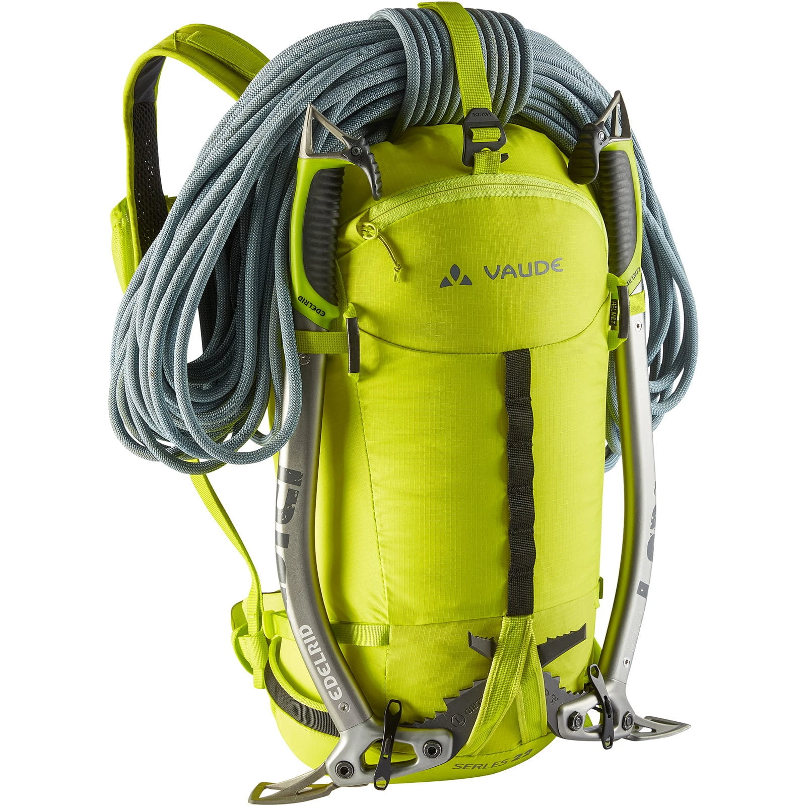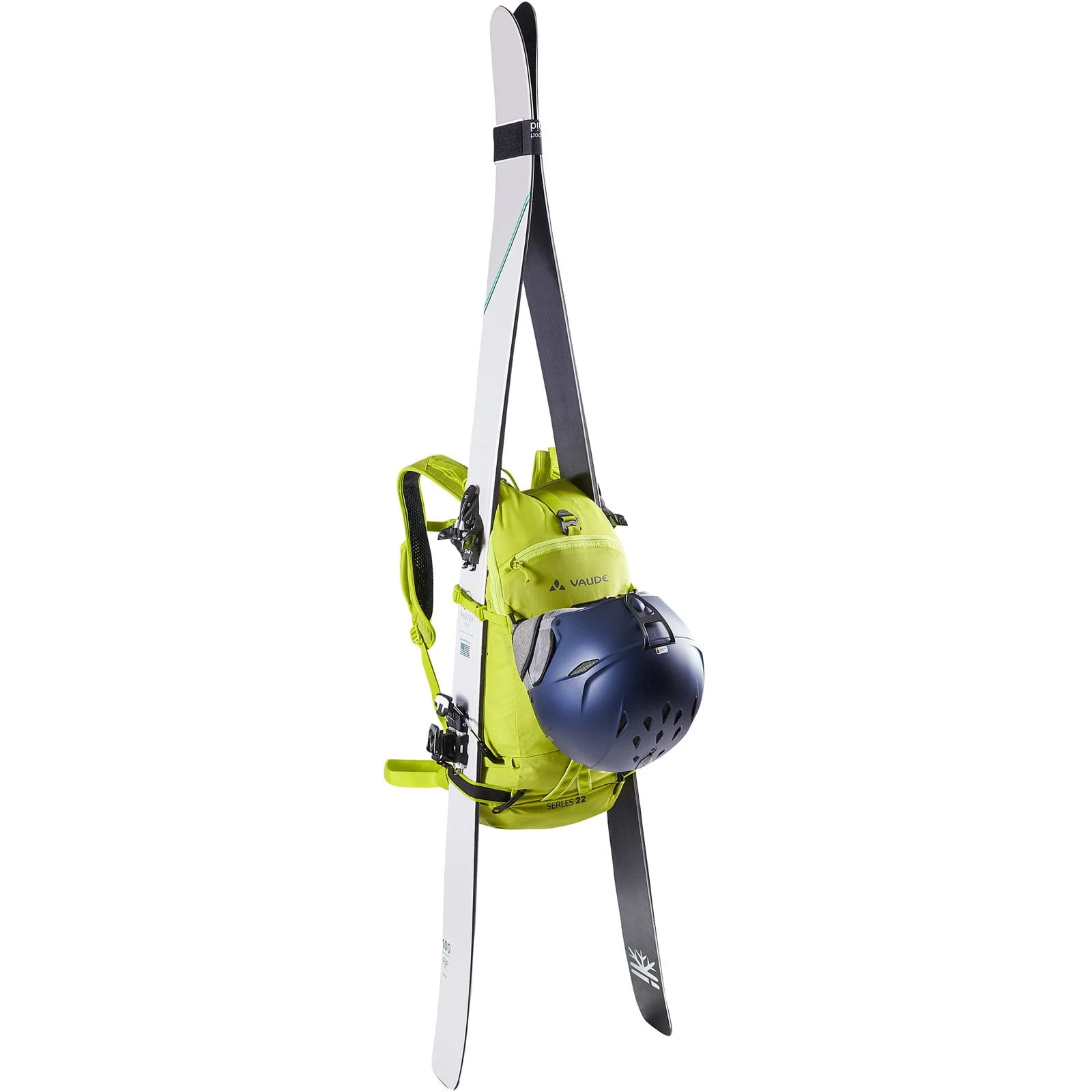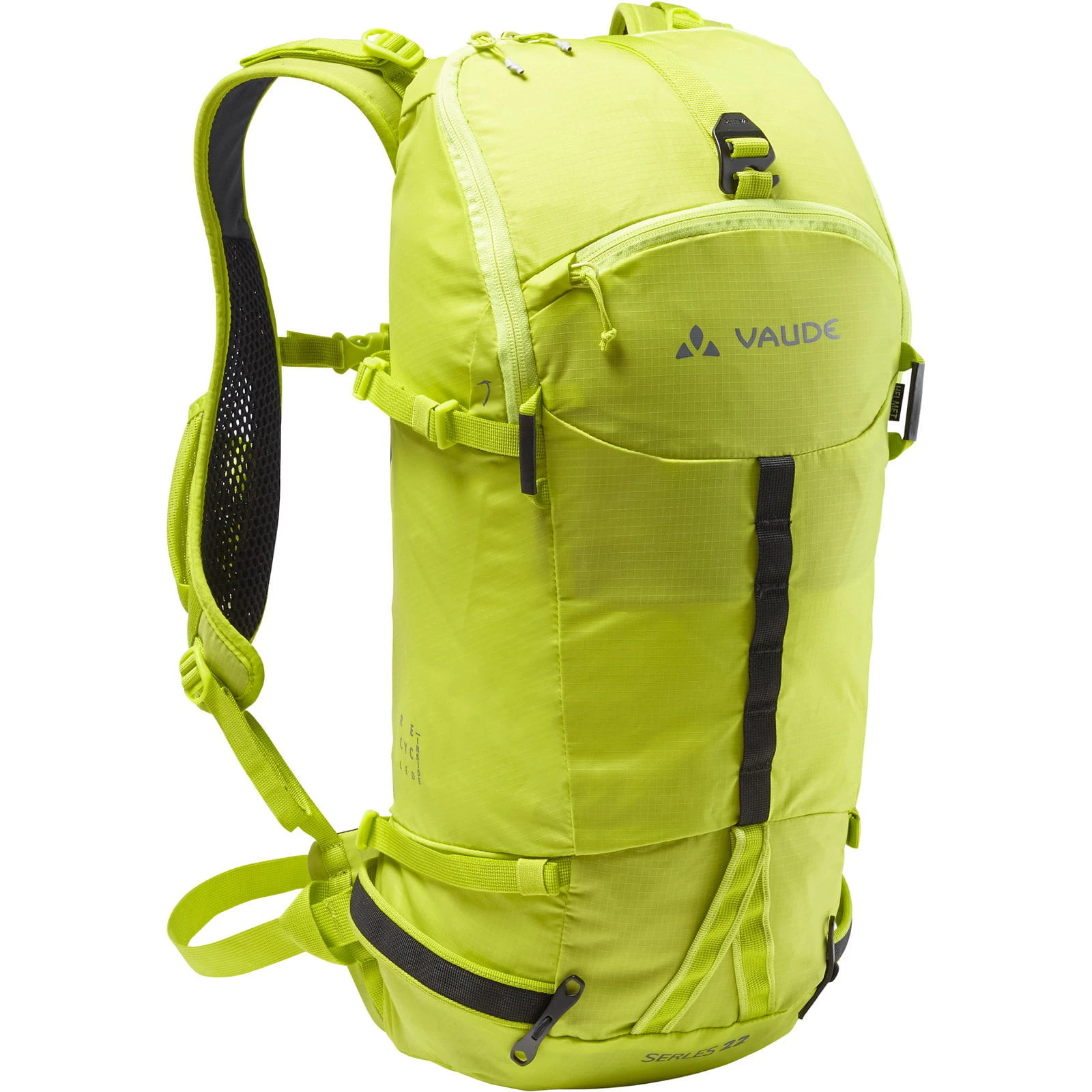 Der Serles 22 von VAUDE ist ein leichter, vielseitiger Tourenrucksack für den ganzjährigen Einsatz beim Skitourengehen, Bergsteigen und Klettern. Der kompakte Rucksack ist ideal für kürzere und minimalistische Touren im Gebirge. Durch den Körperkontaktrücken (Synergy Mold Light) und die ergonomisch geformten, aus dem Trailrunning inspirierten, Schulterträger sitzt der Alpinrucksack sehr stabil und bequem. VAUDE-Rucksäcke mit dem Rückensystem Synergy Mold Light sind für alpine Aktivitäten zu allen Jahreszeiten und in anspruchsvollem Gelände gedacht. Durch das geringe Gewicht hat man höchste Bewegungsfreiheit, die geprägten Schaumpolster weisen Feuchtigkeit und Schnee ab. Durch einen großen Ventilationskanal entlang der Wirbelsäule wird der Rücken optimal belüftet. Die Ergoshape-Schultergurte sind in dem Bereich, wo er auf den Schultern aufliegt breit und an den Schultergelenken schmal. Der schnell abnehmbare Hüftgurt und die flachen, kurzen Hüftflügel stören nicht beim Klettern und Tragen eines Sitzgurts. In der elastischen Einschubtasche und der Netz-Reißverschlusstasche auf den weich gepolsterten Schulterträgern können Handy, GPS-Gerät oder Müsliriegel schnell zugänglich verstaut werden. Durch den großen Reißverschluss erhält man ebenfalls einen schnellen Zugriff auf das Hauptfach, in dem unter anderem eine Trinkblase und die herausnehmbare Safety Kit Tasche für die Lawinenausrüstung Platz finden. Natürlich lässt sich der Touren- und Kletter-Rucksack flach und effektiv komprimieren. Die Ski können seitlich befestigt werden, Pickel, Stöcke oder Eisgeräte auf der Front. Oben am Skitouren-Rucksack befindet sich eine verstaubare Seilhalterung. Ein Helm und weitere Ausrüstung kann an speziellen Schlaufen angehängt werden. Der Serles 22 besteht aus robustem recyceltem Polyamid und richtet sich an umweltbewusste Bergsportler, die mit einem einzigen, leichten Rucksack eine große Bandbreite an alpinen Unternehmungen abdecken möchten.