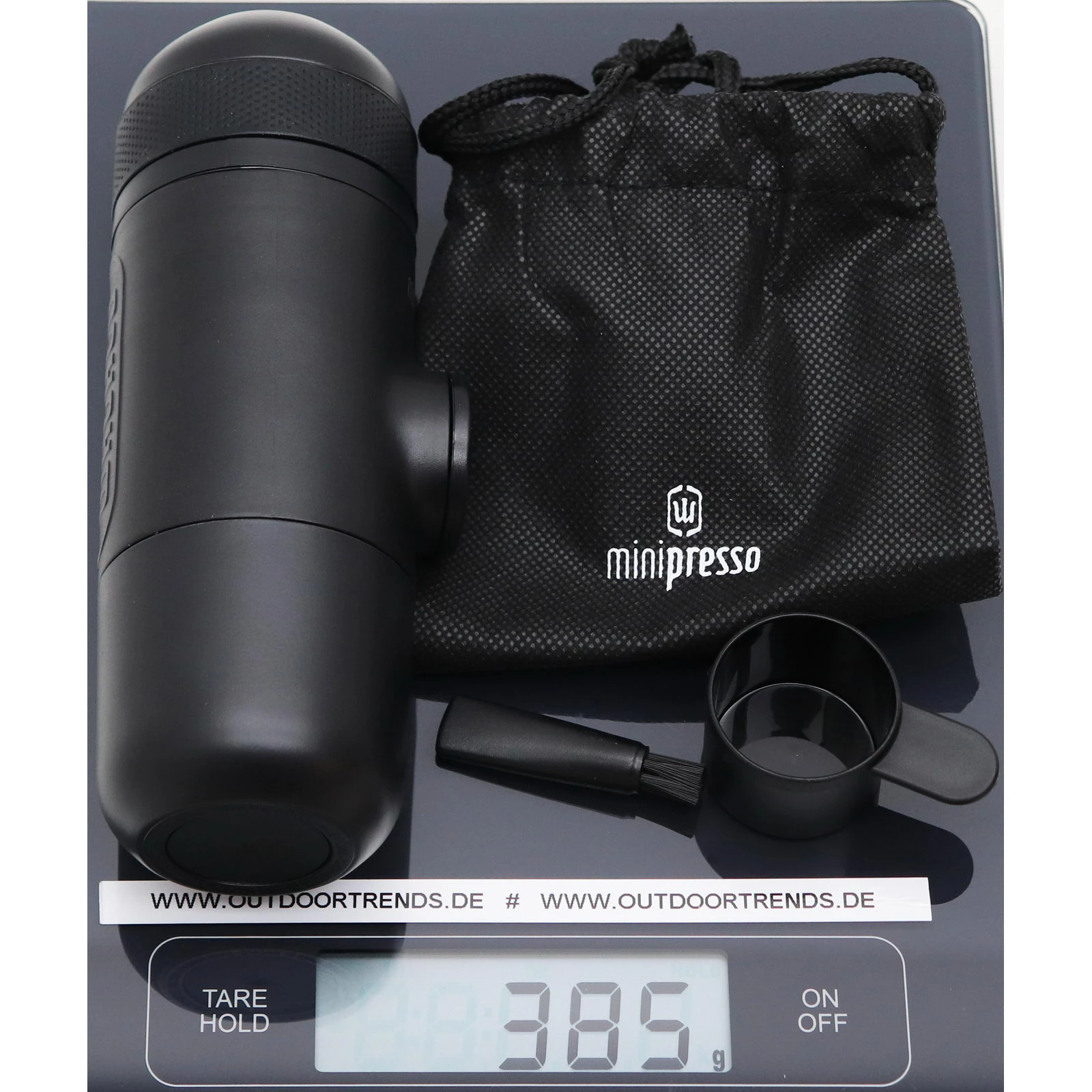 Merkmale: Fassungsvermögen Wasser: 70 ml – Fassungsvermögen des Bodens: 8 g – Durchschnittlicher Druck: 8 bar – Hinweis: Minipresso GR erhitzt kein Wasser, Minipresso darf NICHT in die Spülmaschine – Lieferumfang: Minipresso, Aufbewahrungsbeutel, eingebaute Espressotasse, Filterkorb, Portionierer, Bürste